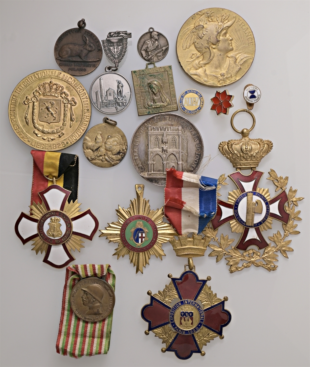 Medagliere con vari premi per esposizioni nazionali e internazionali.