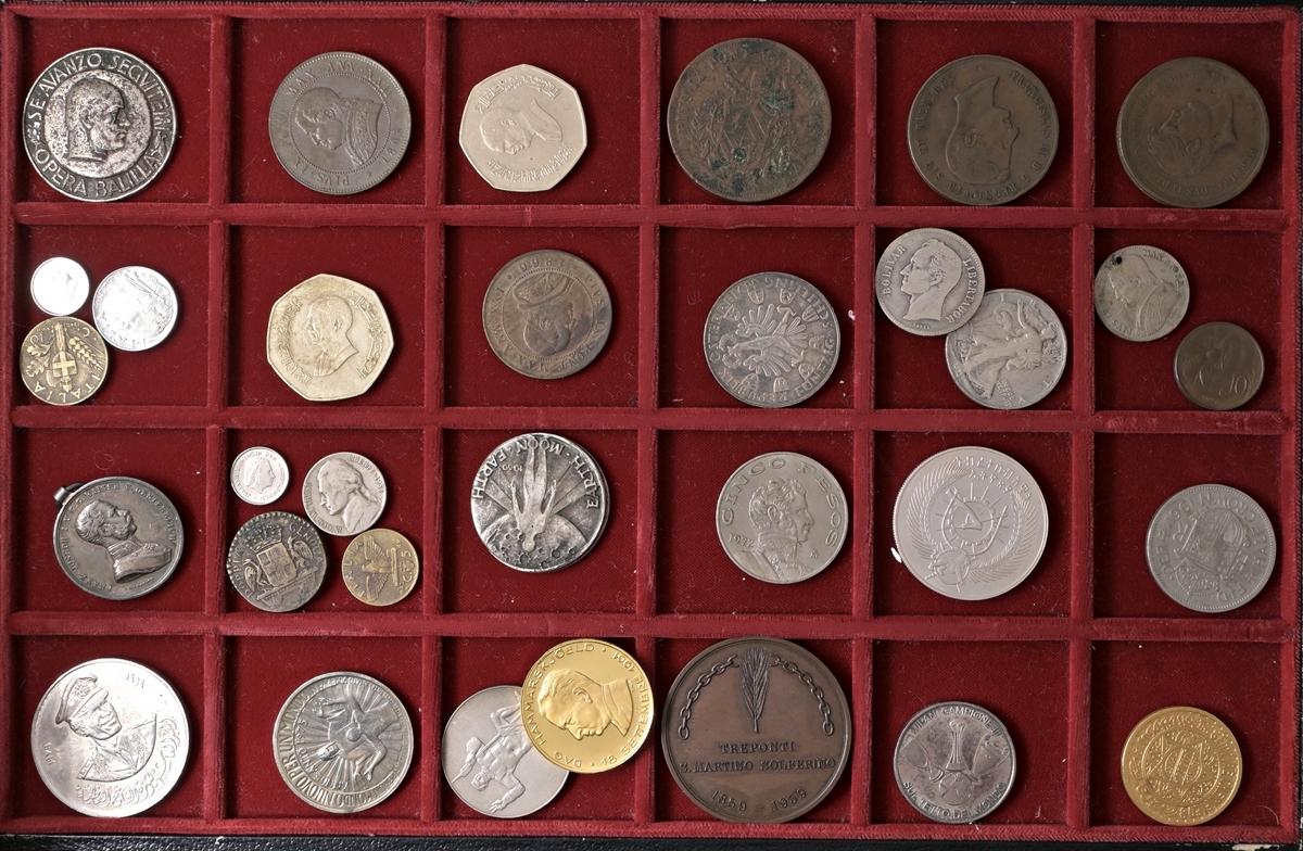 Accumulo famigliare con svariate monete, medaglie e pesi monetali: presenze in argento.