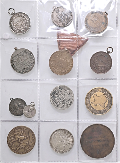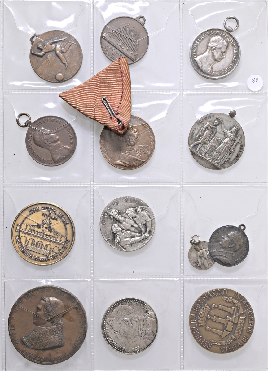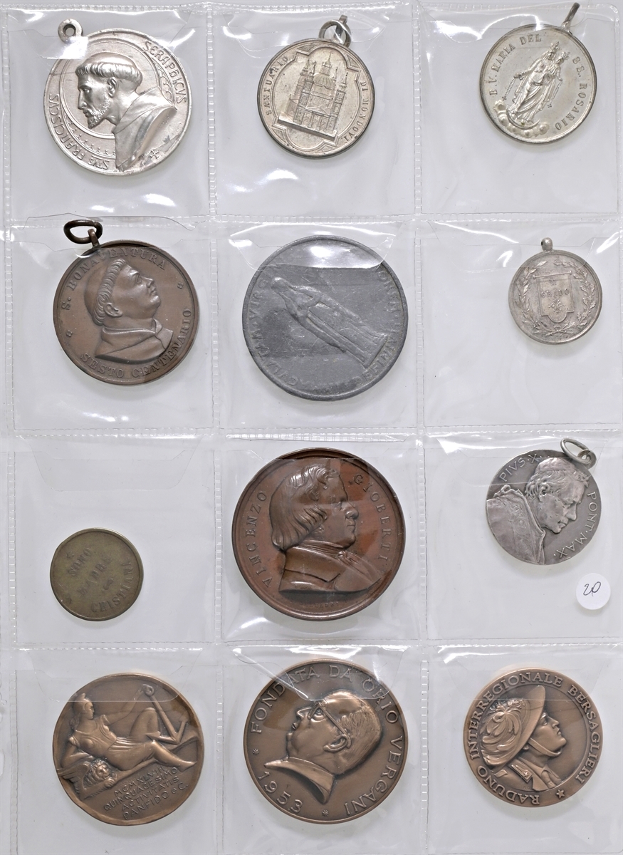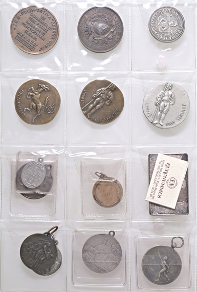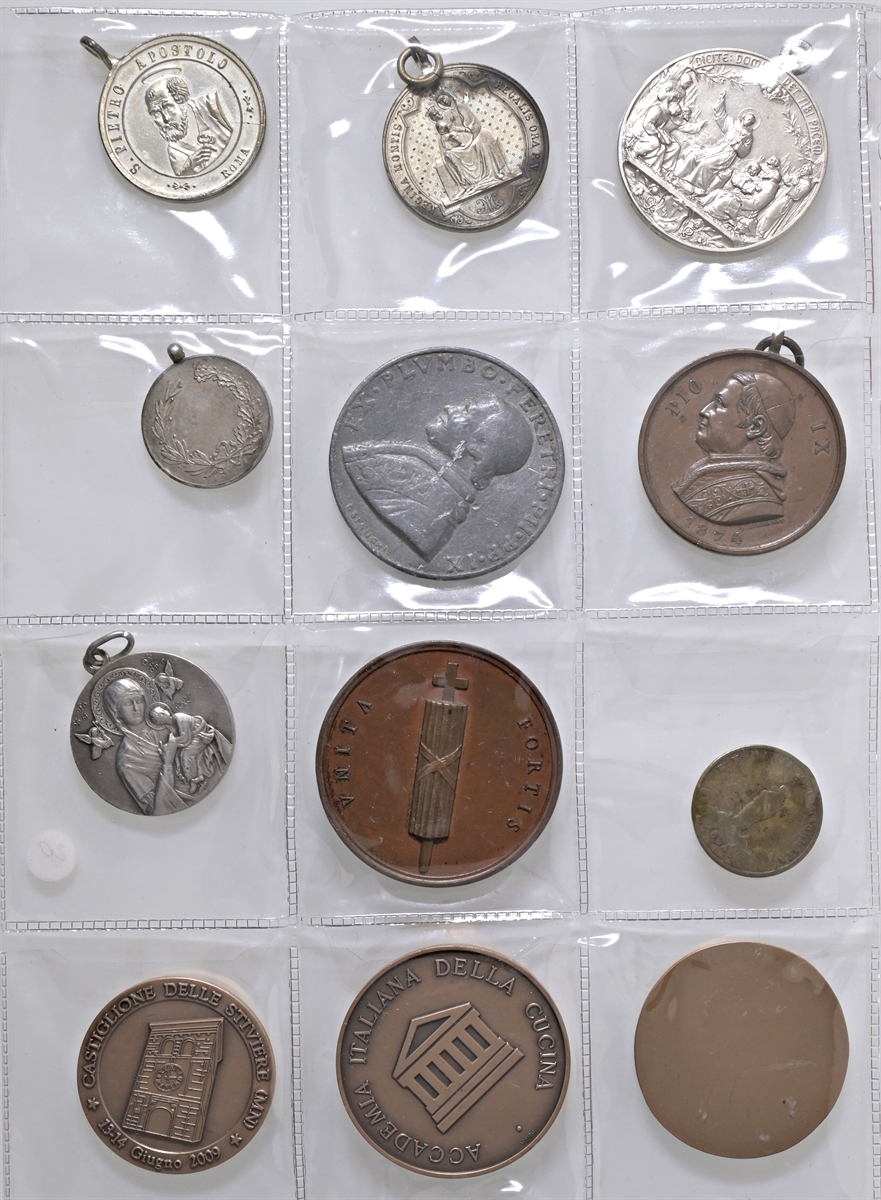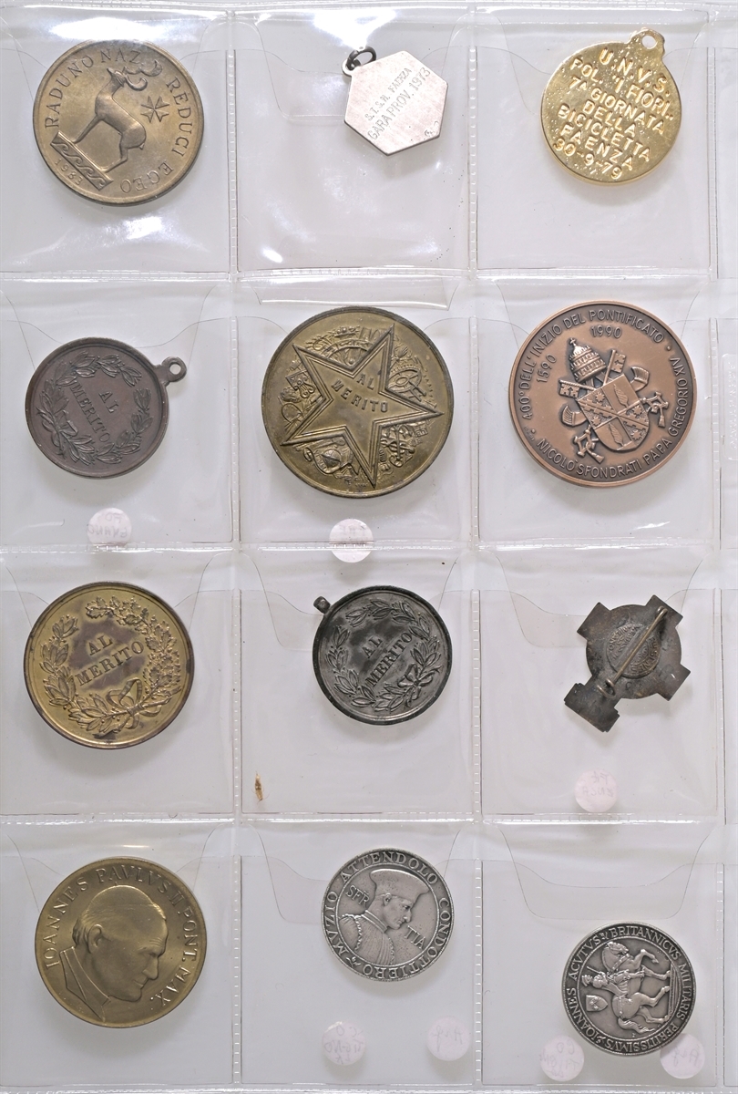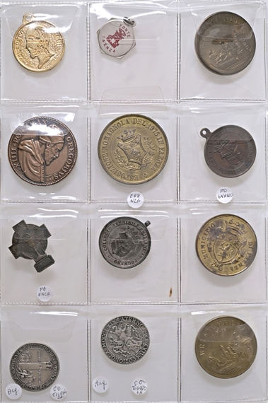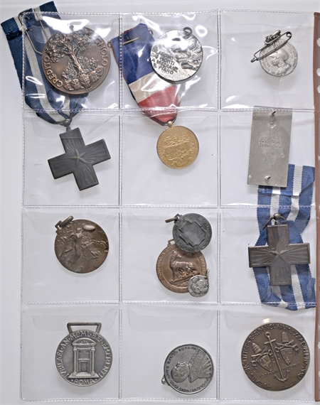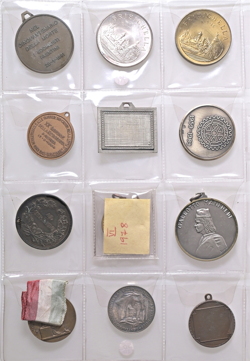 Interessante lotto di n. 77 medaglie compreso un lingotto in argento, distintivi. Vengono trattate le tematiche più svariate tra cui personaggi, Papi, diverse città della Romagna tra cui Faenza, Brisighella...