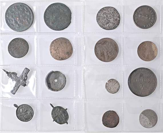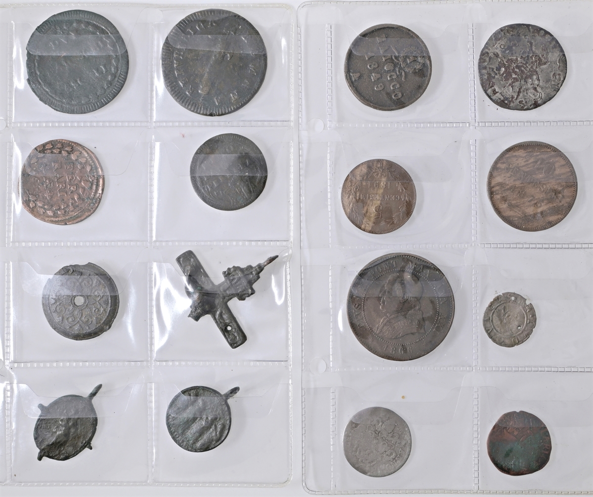 Tesoretto famigliare comprendente 73 monete, medaglie, gettoni etc etc di varie città, personaggi, metalli vari.