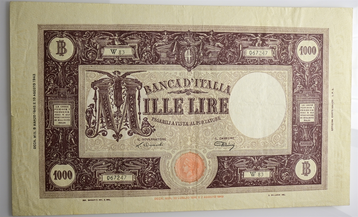 Filigrana: Nell'ovale testa dell'Italia turitta con stella; nel bordo verticale sinistro "BANCA D'ITALIA", in quello destro "LIRE 1000".