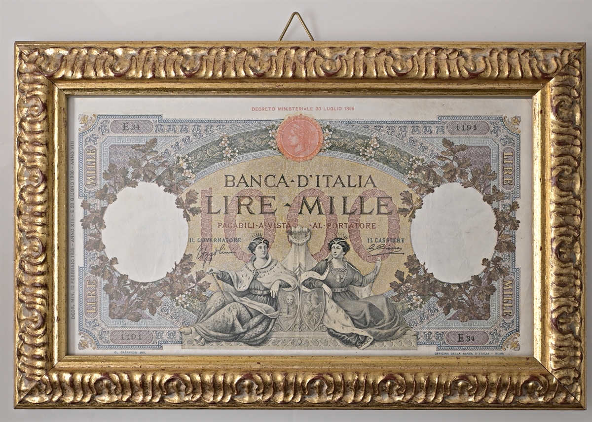 Dr. Due maestose figure femminili sedute, in basso al centro, con il bastone del comando e poggianti sugli stemmi delle città che rappresentano, venezia e Genova. Rv. Nel medaglione centrale, riproduzione del gruppo scultoreo un tempo ornante la facciata di palazzo Kock, sede della Banca d’Italia in Roma, raffigurante le allegorie dell’Agricultura, Industria e Commercio.