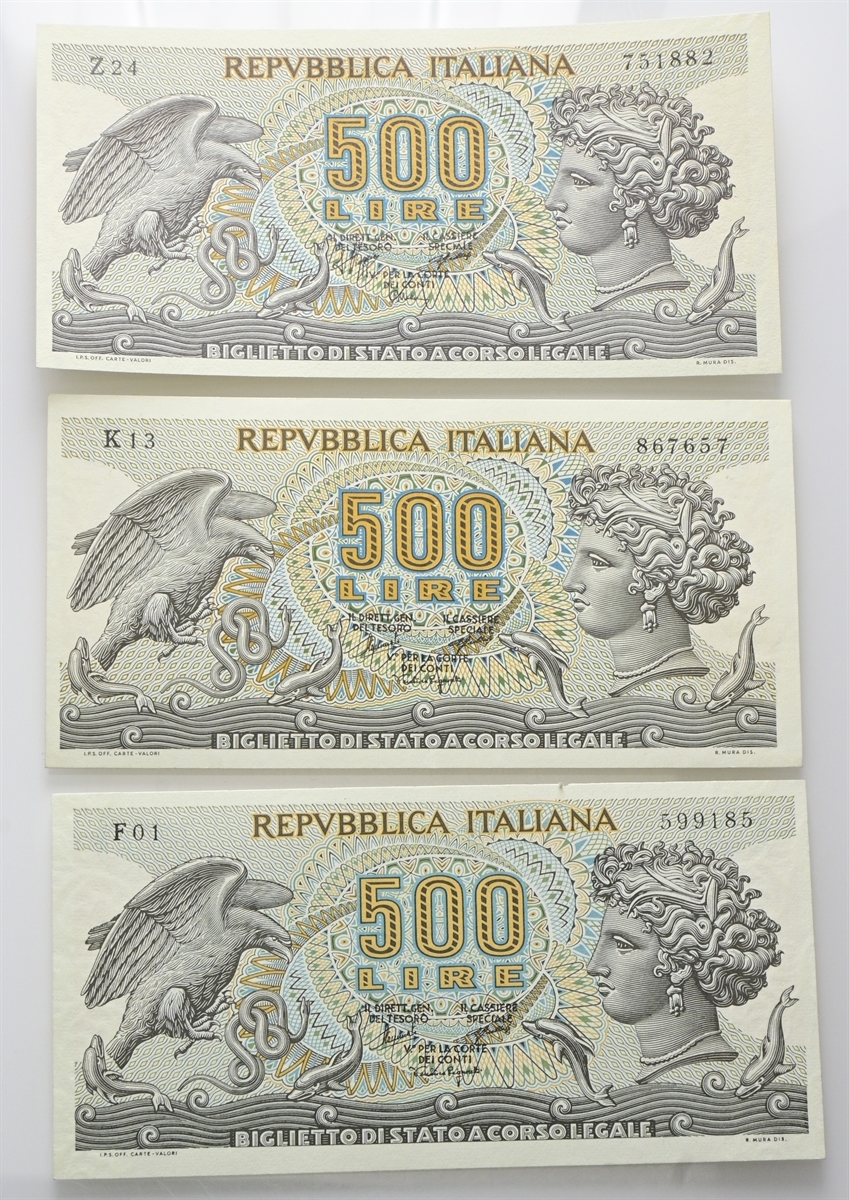 Vittorio Emanuele III e Repubblica Italiana. Lotto di 15 esemplari: 1+2 Lire +50 Lire Banca d’Italia e 9 esemplari da 500 Lire Repubblica 1966-67-1970 in FDS.+1 da 10 lire 1 da 100 lire +1 da 2000.