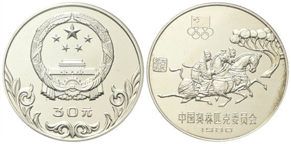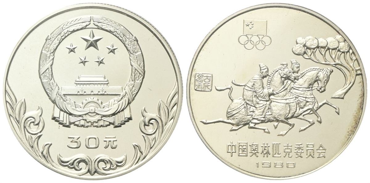 Repubblica Popolare Cinese, dal 1949. 30 Yuan Piedfort 1980. Giochi olimpici estivi, Mosca 1980 - Equitazione.