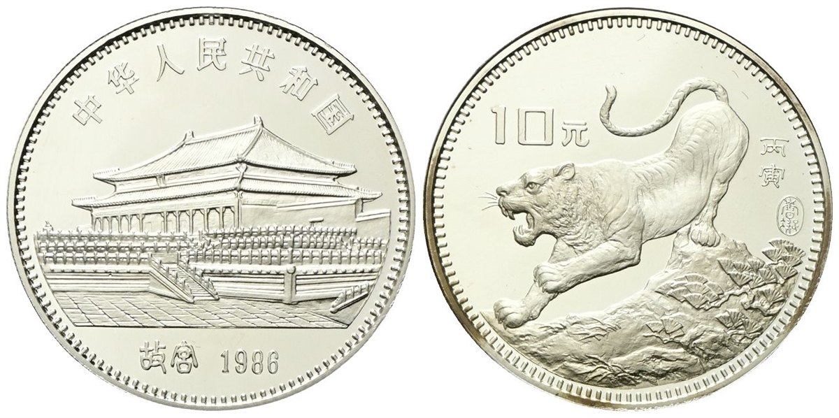 Repubblica Popolare Cinese, dal 1949. 10 Yuan 1986. Calendario cinese - Anno della tigre.