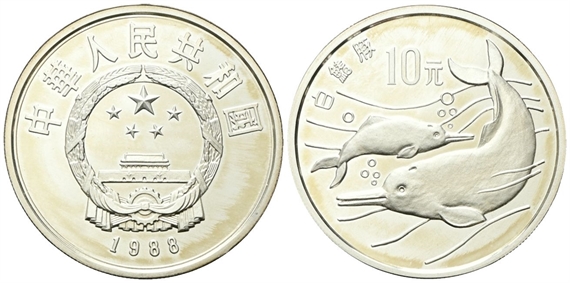 Repubblica Popolare Cinese, dal 1949. 10 Yuan 1988. Animali rari - Delfino dello Yangtze.