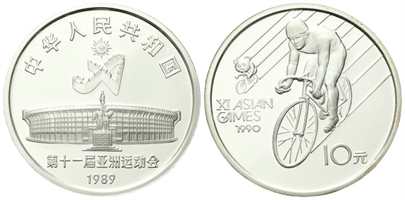 Repubblica Popolare Cinese, dal 1949. 10 Yuan 1989, Giochi asiatici, Pechino 1990 - Ciclista.