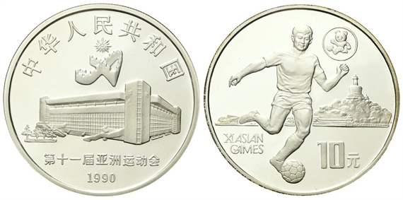 Repubblica Popolare Cinese, dal 1949. 10 Yuan 1990, Giochi asiatici, Pechino 1990 - Giocatore di calcio.
