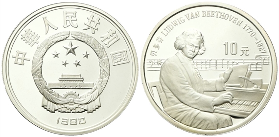Repubblica Popolare Cinese, dal 1949. 10 Yuan 1990. Personalità mondiali - Ludwig van Beethoven.