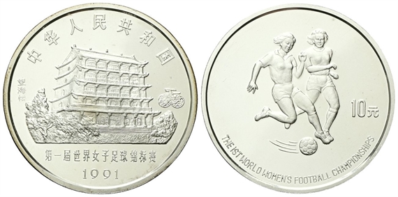 Repubblica Popolare Cinese, dal 1949. 10 Yuan 1991. Coppa del Mondo femminile FIFA.