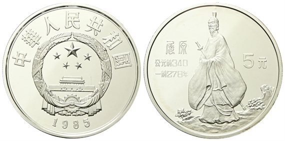 Repubblica Popolare Cinese, dal 1949. 5 Yuan 1985. Personalità cinesi - Qu Yuan.