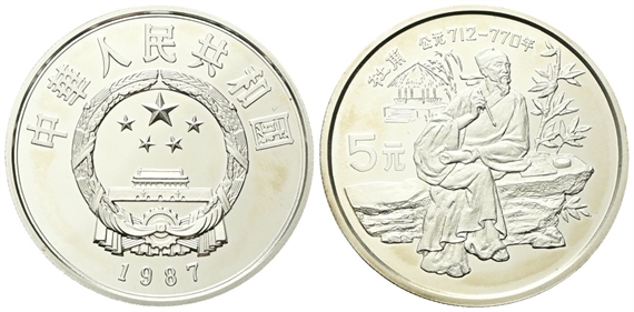 Repubblica Popolare Cinese, dal 1949. 5 Yuan 1987. Personalità cinesi - Du Fu, poeta.