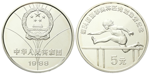 Repubblica Popolare Cinese, dal 1949. 5 Yuan 1988, Olimpiadi estive Seul - Corsa ad ostacoli.