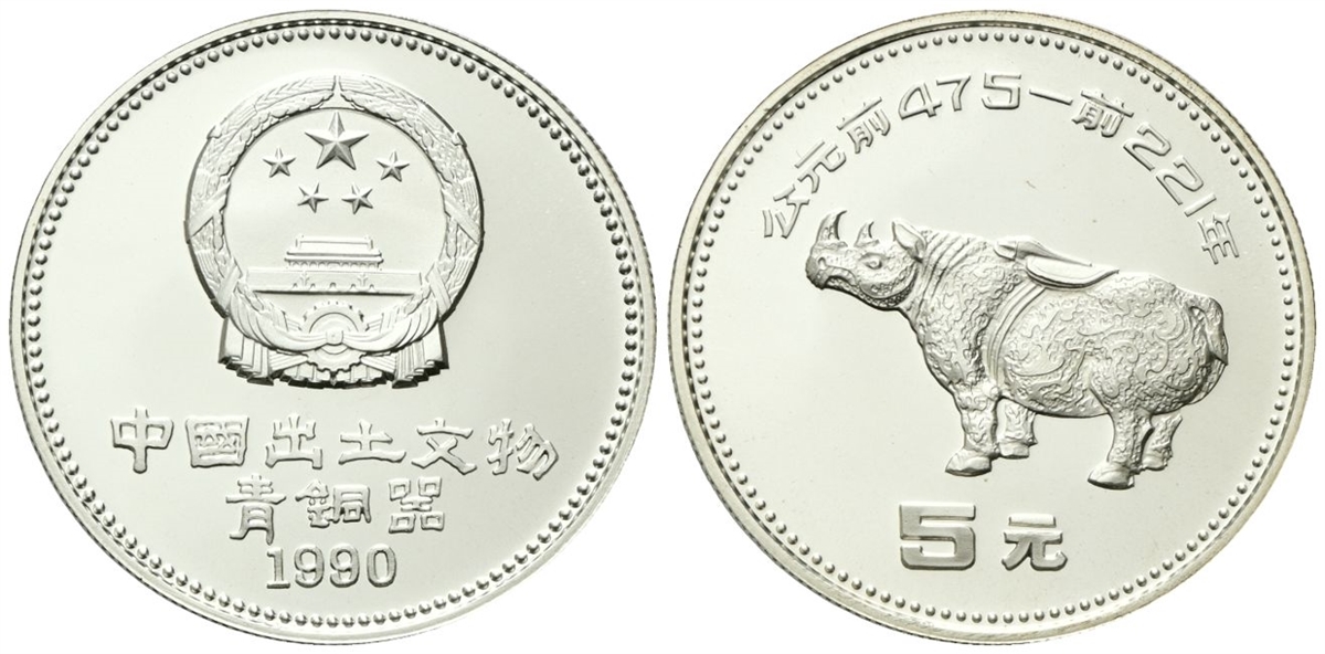 Repubblica Popolare Cinese, dal 1949. 5 Yuan 1990. Reperti dell’età del bronzo - rinoceronte.
