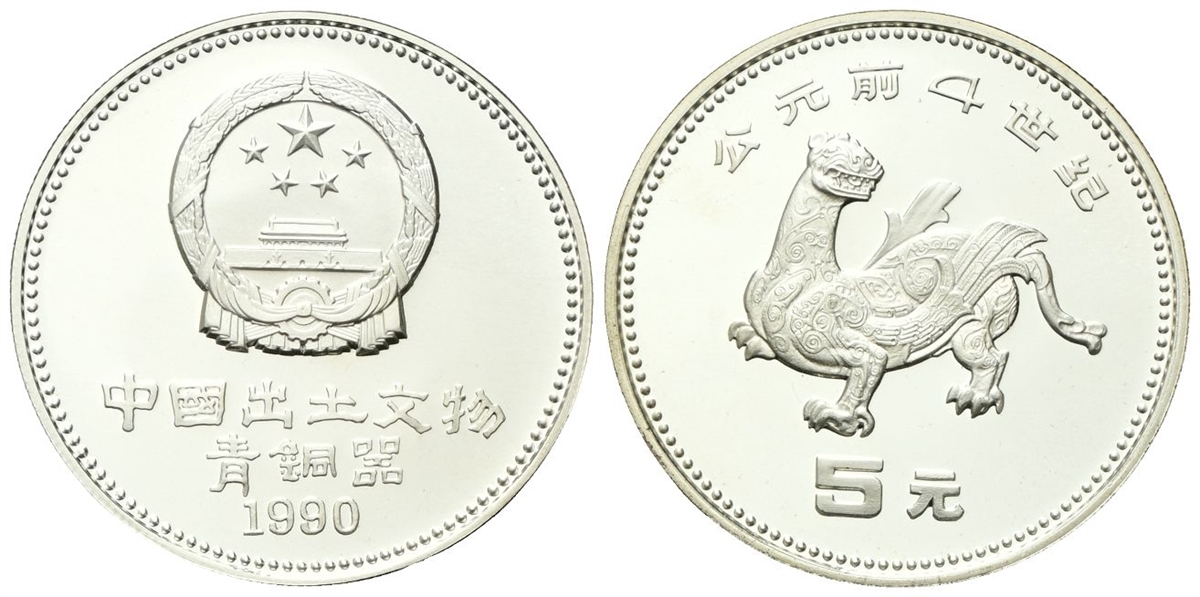 Repubblica Popolare Cinese, dal 1949. 5 Yuan 1990. Reperti dell'età del bronzo, creatura alata.