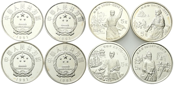 Repubblica Popolare Cinese, dal 1949. 4 esemplari da 5 Yuan 1991 Personalità cinesi - Song Yingxing, Cao Xueqin, Lin Zexu, Hong Xiuquan.