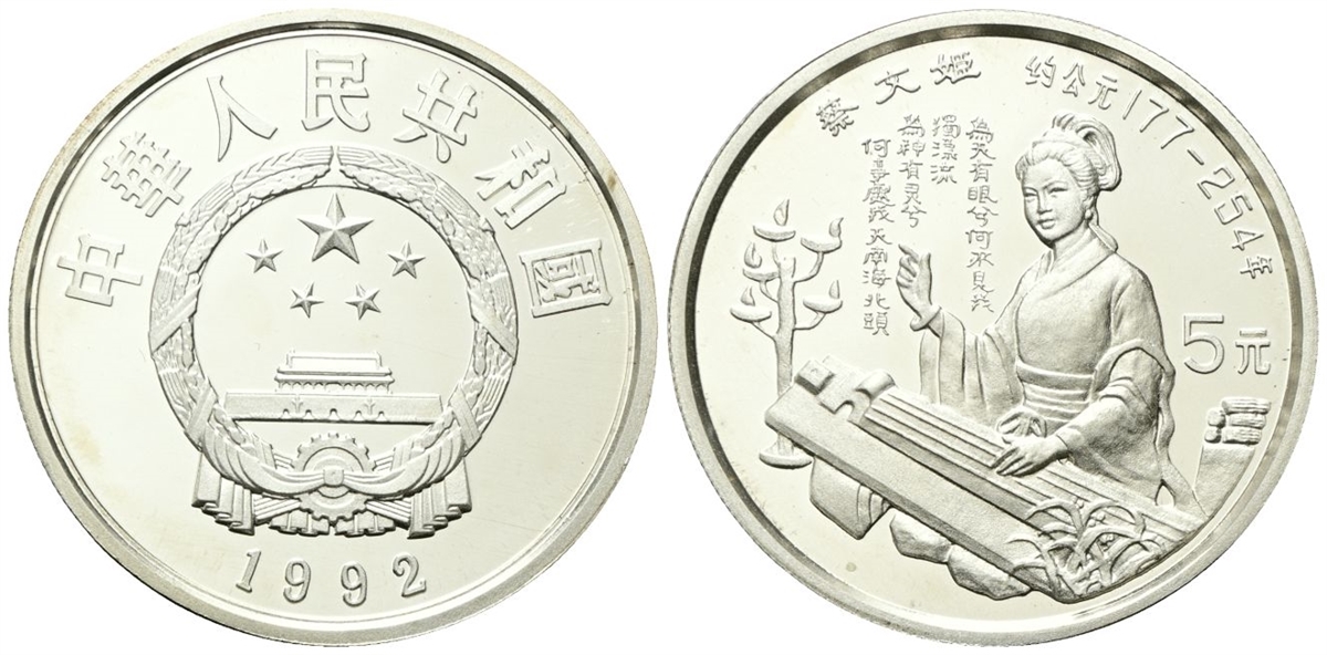 Repubblica Popolare Cinese, dal 1949. 5 Yuan 1992. Personalità cinesi - Cai Wenji.