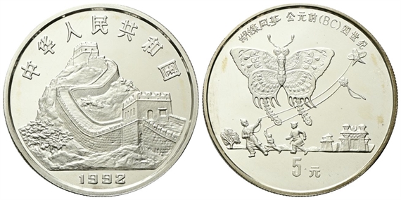 Repubblica Popolare Cinese, dal 1949. 5 Yuan 1992. Antiche invenzioni - Aquilone volante.