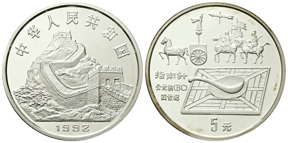 Repubblica Popolare Cinese, dal 1949. 5 Yuan 1992. Antiche invenzioni - Bussola.