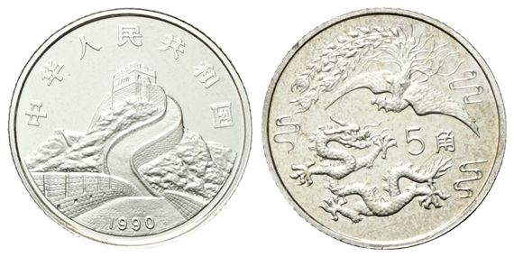 Repubblica Popolare Cinese, dal 1949. 5 Yuan 1990. Drago e Fenice.