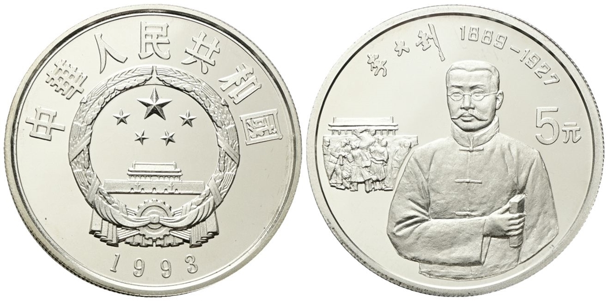 Repubblica Popolare Cinese, dal 1949. 5 Yuan 1993. Personalità cinesi - Li Da-chao.