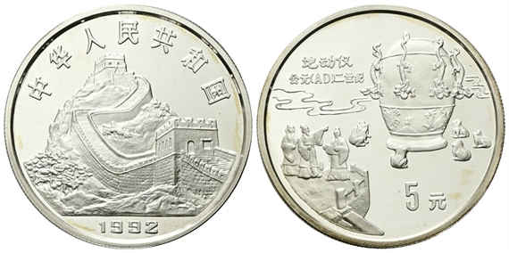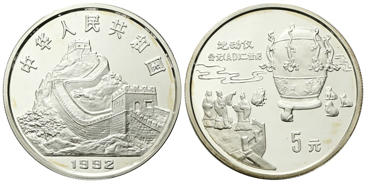 Repubblica Popolare Cinese, dal 1949. 5 Yuan 1992. Antiche invenzioni - Sismografo.