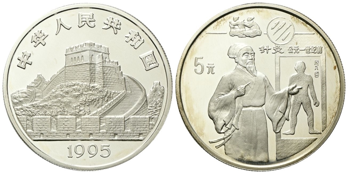 Repubblica Popolare Cinese, dal 1949. 5 Yuan 1995. Antiche invenzioni - agopuntura.