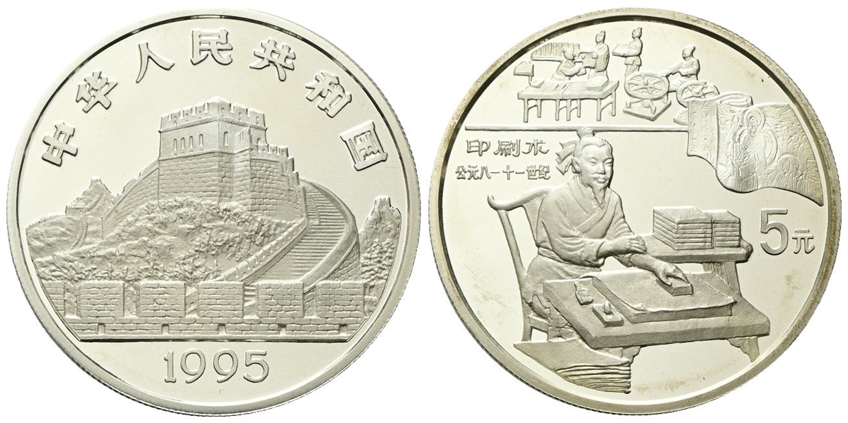 Repubblica Popolare Cinese, dal 1949. 5 Yuan 1995. Antiche invenzioni - Stampa a blocchi individuale.