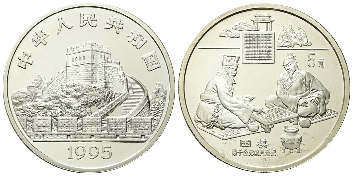 Repubblica Popolare Cinese, dal 1949. 5 Yuan 1995. Antiche invenzioni - giocatori di scacchi.