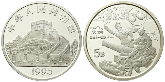 Repubblica Popolare Cinese, dal 1949. 5 Yuan 1995. Antiche invenzioni - Cannone e potenza d'arma da fuoco.