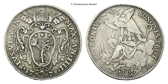 Dr. PIVS VI PONT MAX AN IIII, Stemma ovale in cornice sormontato da triregno e chiavi decussate; sotto, 17 - 78. Rv. S PETRONIVS BONONIAE PROT, Il Santo seduto verso s. su nubi; sotto, armette Boncompagni e della città.