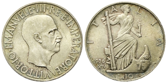 Vittorio Emanuele III, 1900-1943. 10 Lire 1936 a. XIV Roma, Impero.