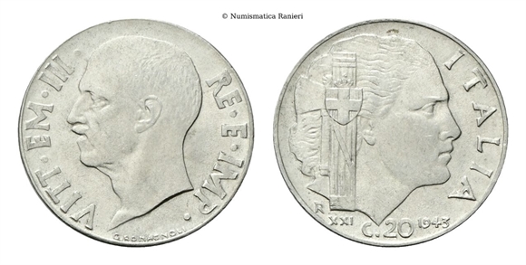 20 Centesimi 1943 a. XXI Roma, Impero.