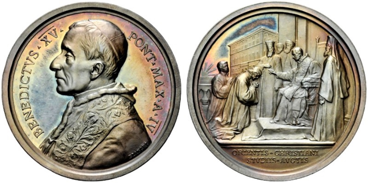 Dr. BENEDICTVS XV PONT MAX A IV Busto a s. con berretto, mozzetta e stola. Rv. ORIENTIS CHRISTIANI STVDIIS AVCTIS Il Pontefice seduto in trono riceve l'omaggio di vari prelati orientali ai quale indica l'edificio destinato agli studi superiori delle discipline orientali.