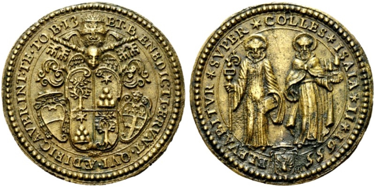 Dr. ET BENEDICTI ERVNT QVI ÆDIFICAVERINT TE TOB 13 Stemma del pontefice sormontato da triregno e chiavi decussate, con putto in cimasa, accostato dalle armi del Cardinale legato Lomellini e della città di Bologna. Rv. ELEVABITVR SVPER COLLES ISAIA II 1655 San Benedetto, con pastorale e libro, e San Romualdo, con la Città nella mano s., stanti di fronte; sotto, nel giro, armetta Boncompagni.