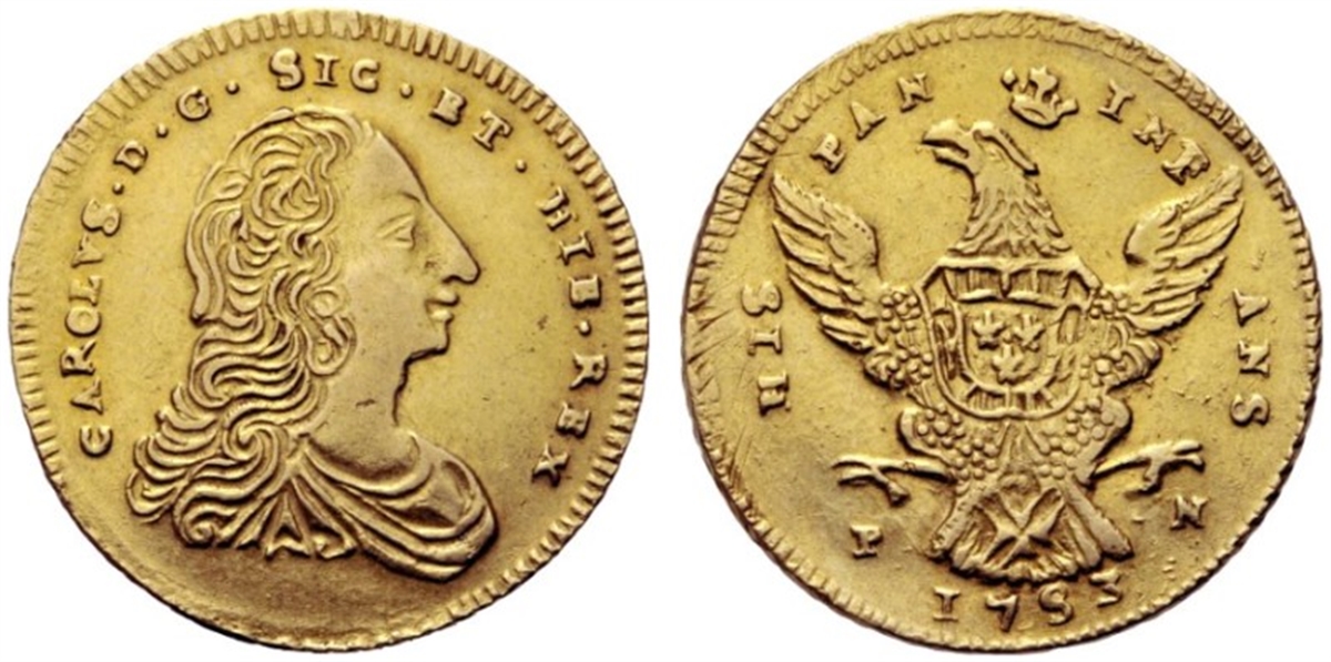 Dr. CAROLVS D G SIC ET HIE REX Busto a d. Rv. HIS PAN INF ANS Stemma caricato su aquila coronata ad ali spiegate e volta a s.; sotto gli artigli, sigle, P N.
