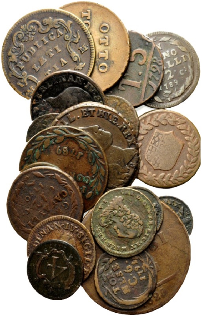 NAPOLI - Autorità emittenti varie. Date varie. - Lotto di n. 21 monete del regno di Napoli dal 1700 al 1800. Si segnala: Publica da 3 1756, Tornese da 6 1756, 8 Tornesi 1796 e 1797.