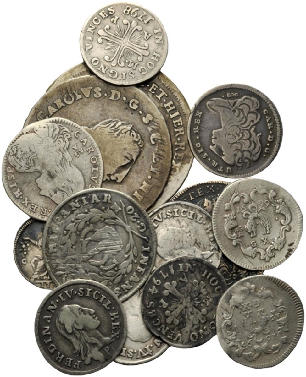NAPOLI - Autorità emittenti varie. Date varie. - Lotto di n. 14 monete del regno di Napoli e del Regno di Sicilia. Si segnala: Carlino 1755, 10 grana 1693 e 1699, 6 Tarì 1735.