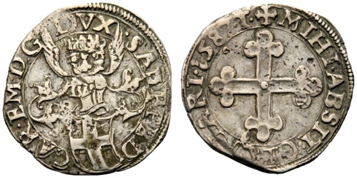 Dr. CAR EM D G DVX SAB P PED Scudo a targa inclinata, con elmo, cimiero e lambrecchini. Rv. MIHI ABSIT GLORIARI 1587 T Croce mauriziana.