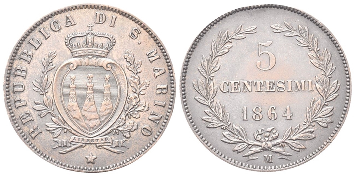 SAN MARINO - Vecchia monetazione, 1864-1938. - 5 Centesimi 1864.