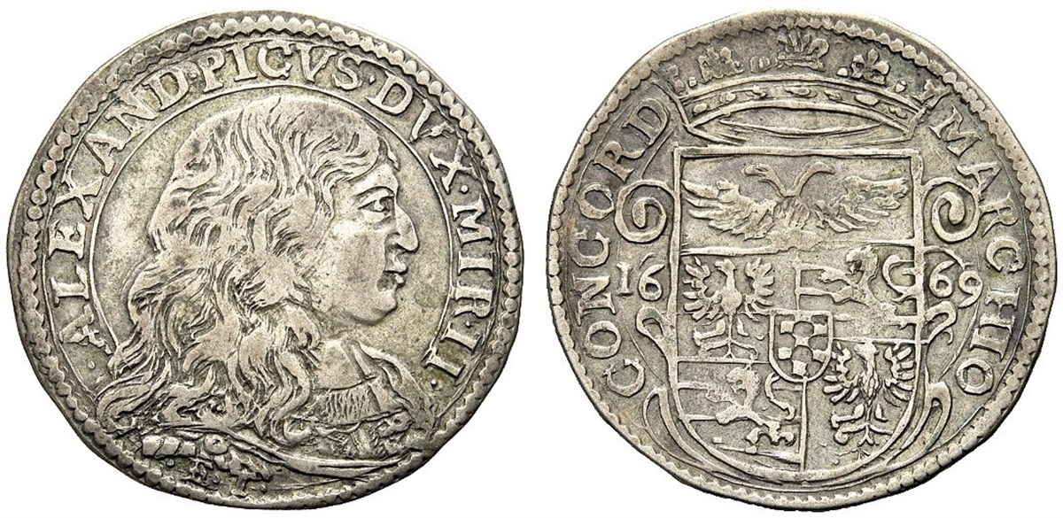 Dr. ALEXAND PICVS DVX MIR II Busto a s., sotto la spalla E T. Rv. CONCORD MARCHIO Stemma coronato e ornato, ai lati 16 69.