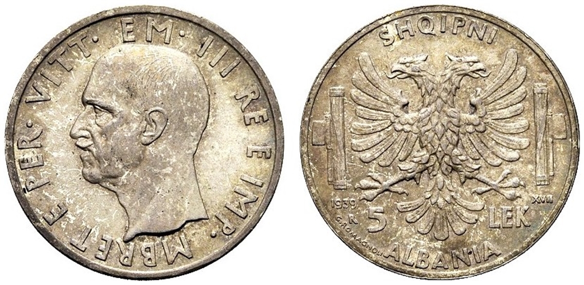 REGNO D’ALBANIA - Vittorio Emanuele III, 1939-1943. - 5 Lek 1939 a. XVII Roma.