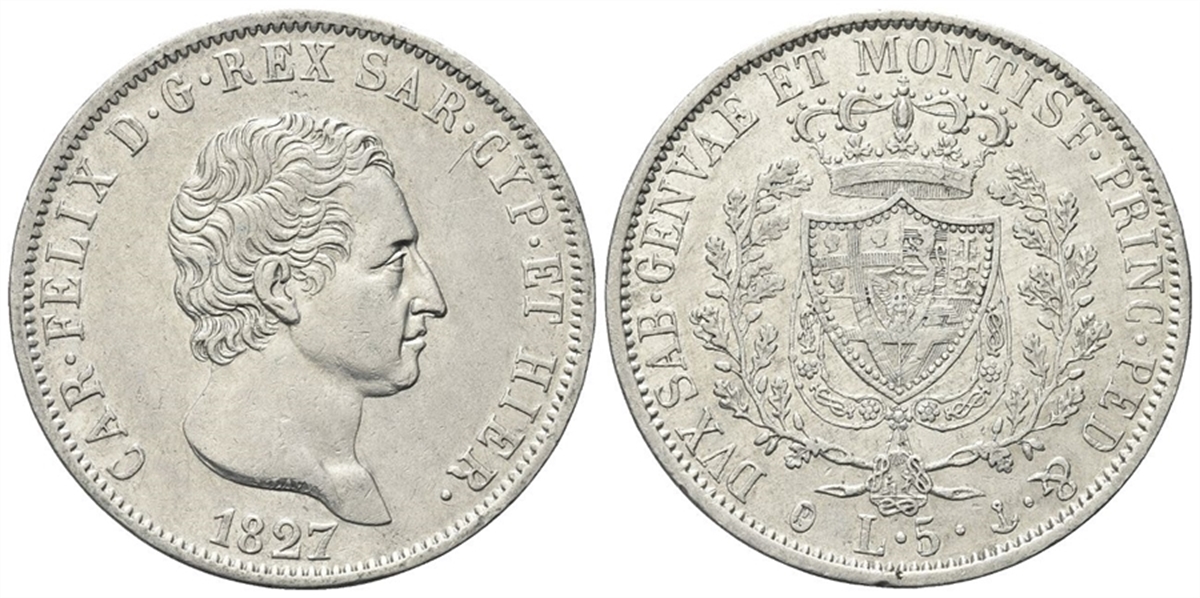 REGNO DI SARDEGNA - Carlo Felice, 1821-1831. - 5 Lire 1827 Genova.