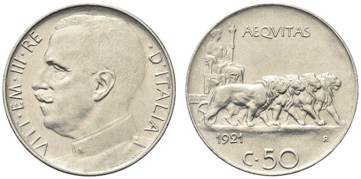 Vittorio Emanuele III, 1900-1943. 50 Centesimi 1921 Roma, Leoni, bordo liscio.