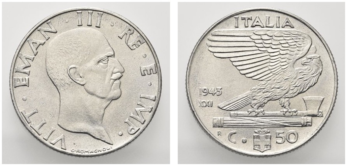 REGNO D’ITALIA - Lotto di n. 6 esemplari da 50 Centesimi datati dal 1939 (anti-magn.),1939 a. XVIII (anti-magn.), 1940 (anti-magn.), 1941, 1942 e 1943 Impero.