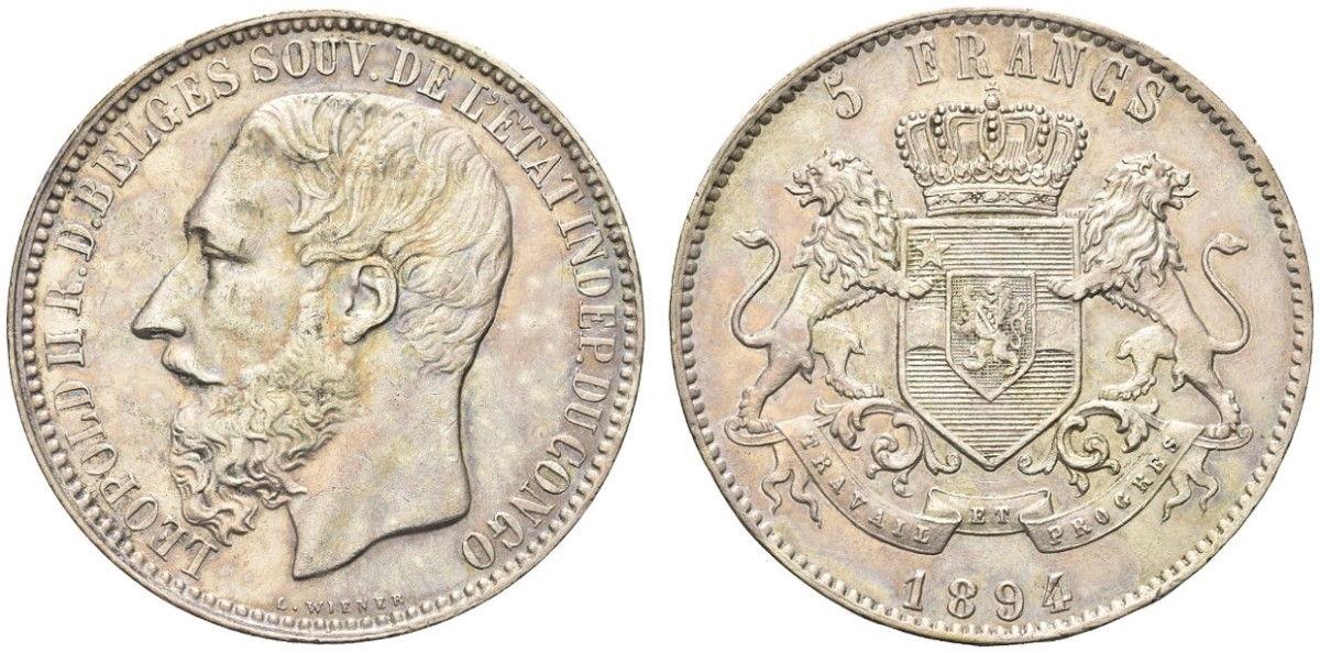 CONGO, Stato IndipEndente - Leopoldo II, 1885-1908. - 5 Francs 1894, Bruxelles.