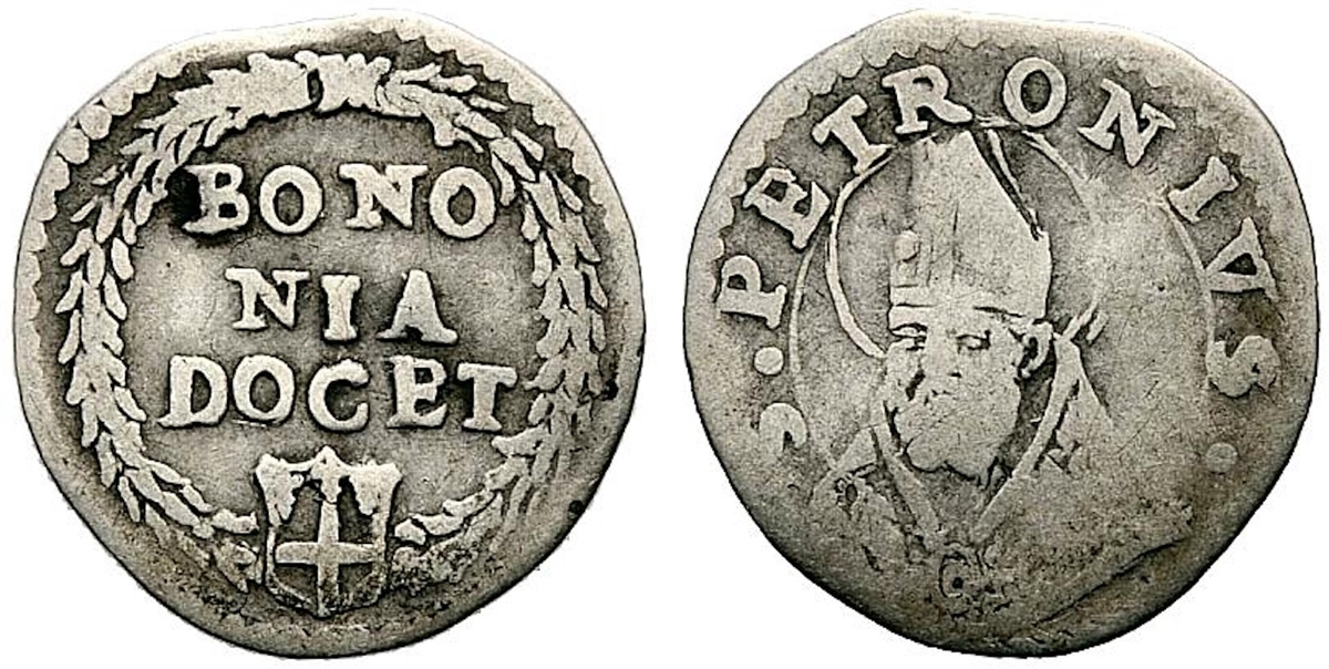 Dr. BONO NIA DOCET in ghirlanda chiusa in basso da stemma di Bologna con croce. Rv. S PETRONIVS nel campo busto mitrato del santo.