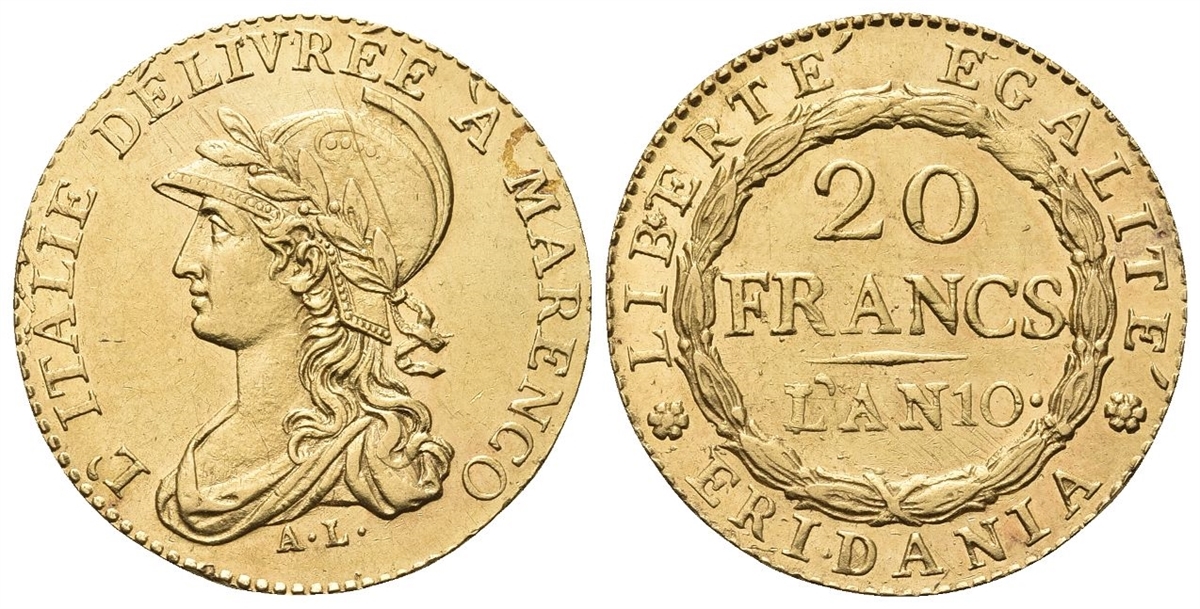 Dr. L'ITALIE DELIVRÉE A' MARENCO. Mezzobusto galeato e laureato di Minerva a s.; sotto le iniziali, A.L. Rv. LIBERTE' EGALITE' ERIDANIA. 20 / FRANCS/ L' AN 10 Nel campo in serto di lauro legato.