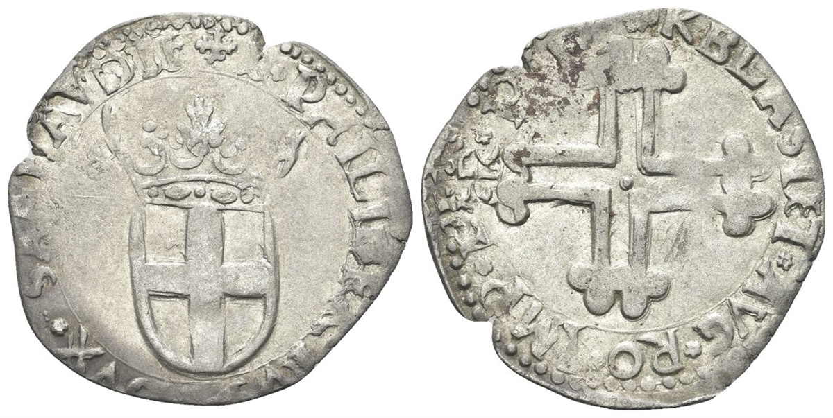 Dr. E PHILIBERTVS DVX SABAVDIE. Scudo sabaudo con corona con 5 fioroni. Rv. KBLASI ET AVG RO IMP VI PER PIF. Croce formata da quattro mezze croci mauriziane.