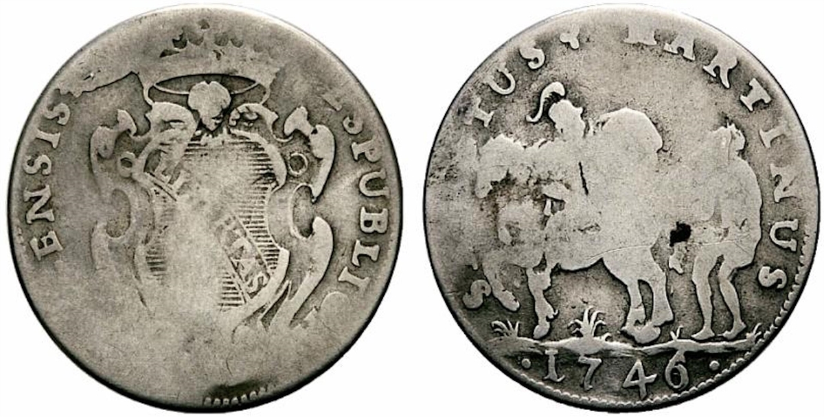 Dr. RESPVBLICA LVCENSIS Scudo semiovale incavato ai lati con banda su cui LIBERTAS in cartella coronata; in alto testa di cherubino e in basso maschera. Rv. SANCTVS MARTINVS Il Santo, a cavallo gradiente a s., in atto di tagliare il mantello pel mendico a lui d’appresso; in esergo 1746.